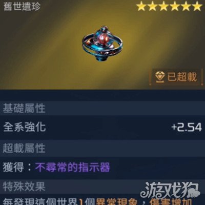 它的外形是一个蓝橙色的陀螺,是一个六星的遗珍,它拥有全系强化的效果,可以直接增加2.54,它的超载属性可以让角色获得不寻常的指示器,特殊效果可以让角色在每发现一个视界异常现象的时候,将自己的伤害提高0.08%。