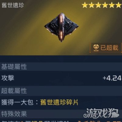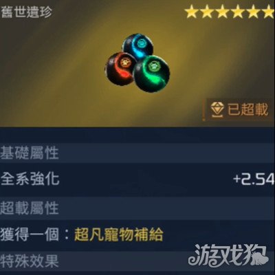 它的外形是彩色的球体,是一个六星的遗珍,基础属性可以带来全系强化的作用,超载属性可以获得一个高仿宝物补给,特殊效果可以让角色在战斗的时候只要拥有一个SSR宝物的话,可以将全系的抗性提高0.65%并生效六个计数。