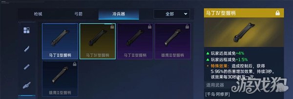 增加恢复速率以后可以更加灵活,并且在翻滚后获得短暂移速加成,方便走位。握柄选择马丁型握柄,增加玩家之间对战时近战减免和远程减免,打造成为了真正PK利器。