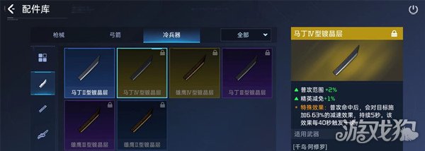 在镀晶层方面有马丁型和雄鹰型这两种橙色配件可以选择,虽然还有其他蓝色和紫色,但是都不如这两款更加有优势。马丁能够增加普攻范围和精英减免,效果为在普攻命中后会对目标施加减速效果,持续5秒钟。
