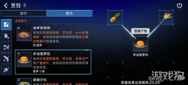 仰望星辰派是第一个要说的紫色食材了,这是一道馅饼菜,如果想要制作这道菜的话,需要四种原材料,第一种是水,第二个是小麦,第三个是鱼类,最后一个则是肉了,食材除了对游戏中的角色有饱腹的作用之外,还有一个效果那就是使对手受到10%的致命伤害,还是一道不错的菜谱的。