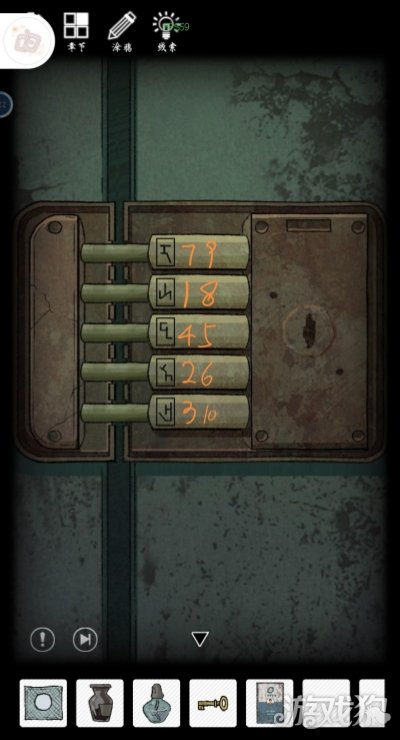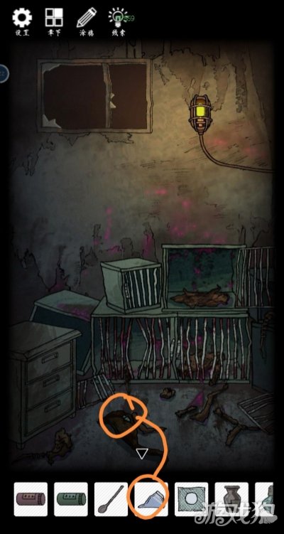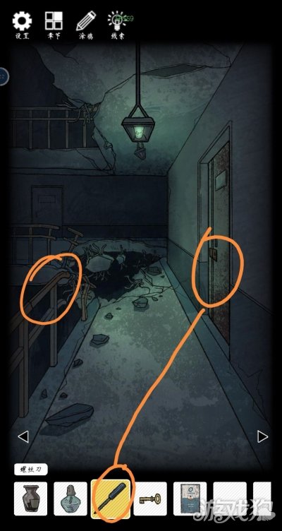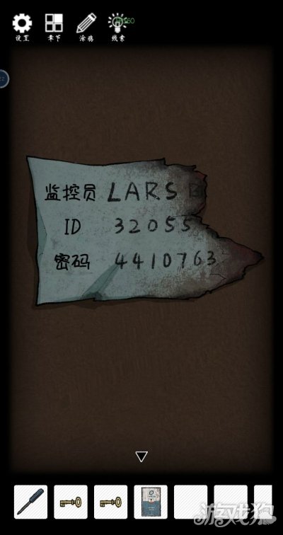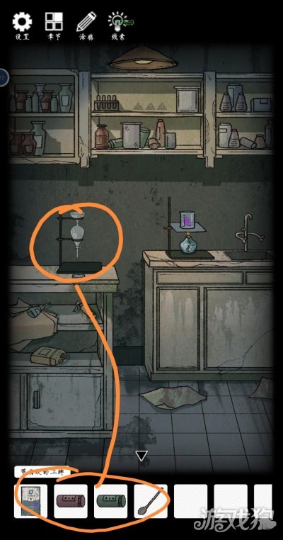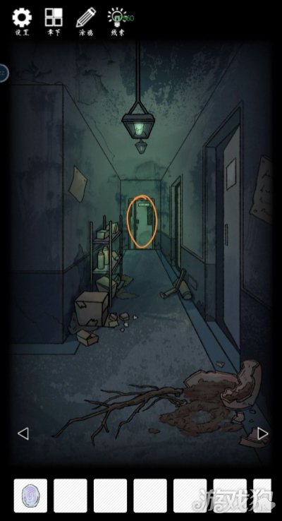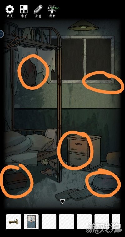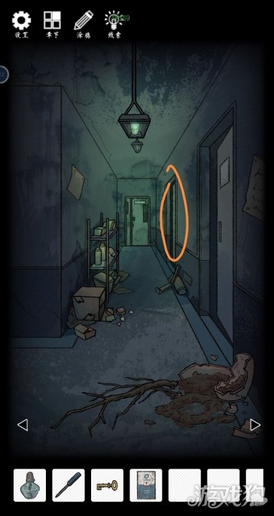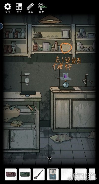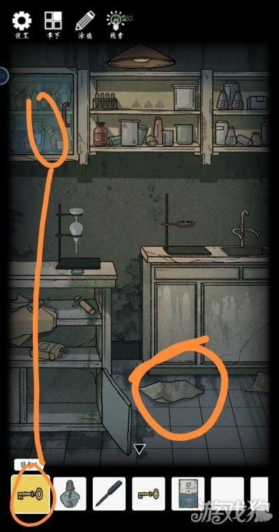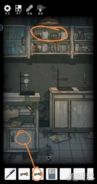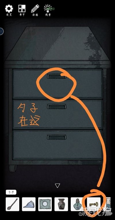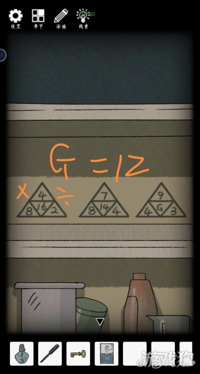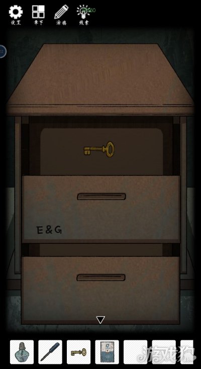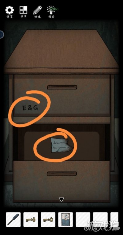 3、退出来,进里面的房间。用钥匙b打开柜子,得到酒精灯。拨开上层杂物,找到关于G的线索。
