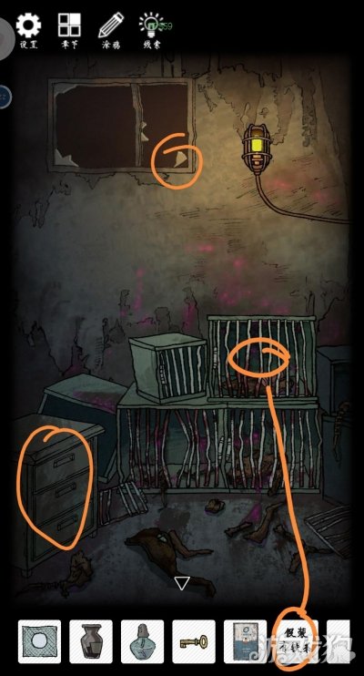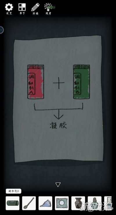 7、窗子上拿到碎玻璃。用铁条撬开笼门,得到调和剂a。点击柜子,用钥匙打开上层,得到调和剂b和提示,中间层拿勺子。