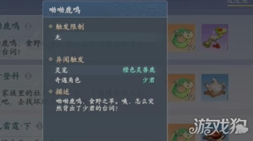 呦呦鹿鸣,这个任务需要小伙伴们去捕捉橙品品质的灵兽鹿,难度是不大的,提升等级足够的话很轻松就能抓到了。