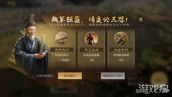 10. 主公应当充分利用每日的征战和军演次数,但不宜急于行动。建议等到武将等级提升至当天可能的最高等级后,再进行征战和军演,以确保能通过更多的关卡。