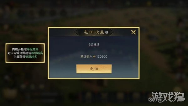2.根据实际情况选择屯田时机。开垦地与对应内城资源建筑的等级越高,屯田获得的资源越多,但1-5级的开垦地屯田资源差距并不大,主公还是得根据自身实际情况选择屯田时机,好钢用在刀刃上。