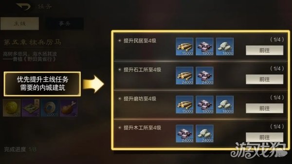 5.前期以完成主线任务为目标,因此,应综合考虑任务需求与资源投入,合理规划资源储存。在资源充足时,优先升级完成主线任务所需要的内城建筑!