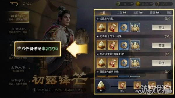 9.积极完成新手活动任务。在游戏中活动任务往往配有丰厚的奖励,建议主公时刻留意这些任务,并积极参与以完成它们,以获得更多的资源,加速主公的发展。