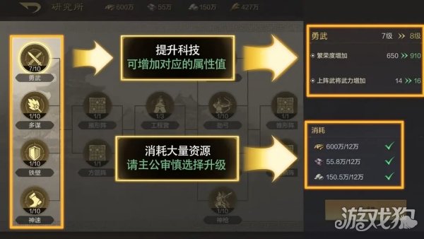 虽然这些科技能显著增强战力,但由于它们需要大量资源,主公们应该更加审慎地选择升级方向。开荒期建议各类科技只升一级,以解锁阵法为核心目的,待中后期再根据自身队伍需求提升对应科技等级。
