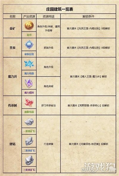 在庄园中最后的建筑【驿站】则需要我们等级达到70级并通关【龙裔领地-铁匠铺】之后才能解锁。驿站可以产出用于在【铁匠铺】锻造装备的素材铁矿石。铁矿石分为:一级铁矿石、二级铁矿石和三级铁矿石。驿站等级越高,产出高等级铁矿石的概率就越高。装备系统在中后期可以大幅提升冒险队伍的实力,并且让我们的冒险队伍有了更多的培养方向,是一个非常重要的系统(装备系统内容较多,在此不做展开,有兴趣的族长大人请留意后续的专栏文章噢)。因此,支撑装备产出的铁矿石的重要性不言而喻。