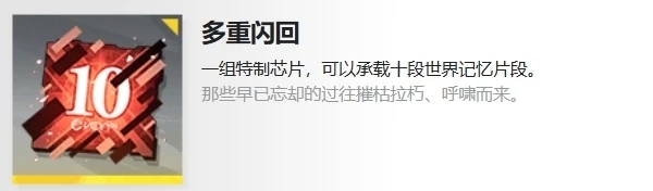 很多玩家们第一次见到多重闪回,想必可能便是在游戏官方福利内容方面看到的。是对于这个特殊的资源,却并不知道它的作用。实际上,多重返回是一组特制的芯片,它的作用是可以承载的十段世界记忆的片段,简单来说就是记忆烙印卡池十连抽。