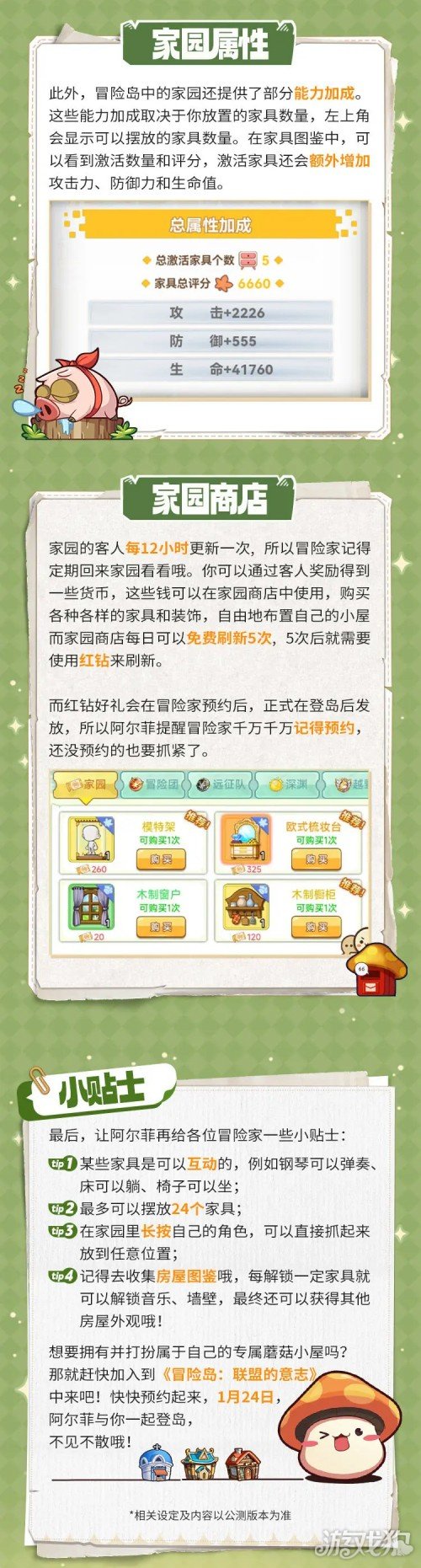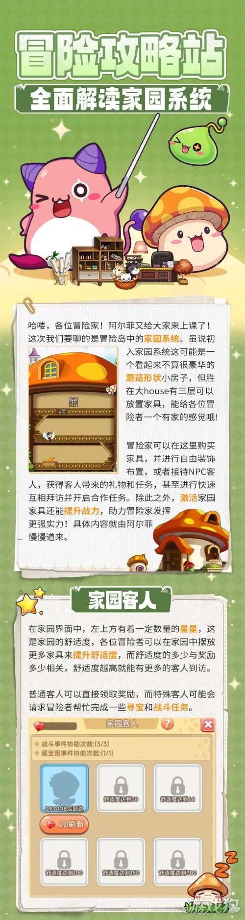 冒险岛联盟的意志家园系统怎么样,教你打造梦幻小屋。冒险家,你是否梦想着拥有一套自己的独栋big house呢,嘿嘿,在冒险岛联盟的意志中就可以实现啦,今天带你了解岛上「家园系统」,了解家园里内部组成、如何装扮家园、如何提升战力……赶紧点击长图,一起划重点学习。