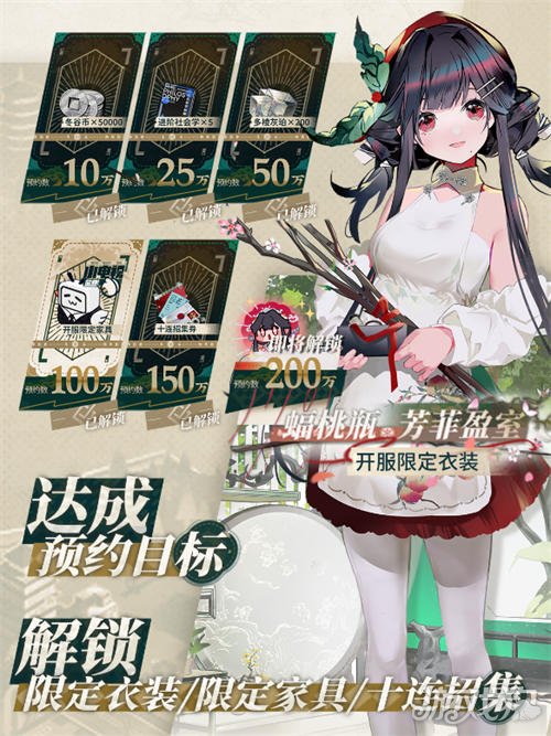 公测预约活动持续进行中,现已解锁开服限定家具、十连招集券等好礼;现在预约,助力解锁蝠桃瓶限定衣装[芳菲盈室]!