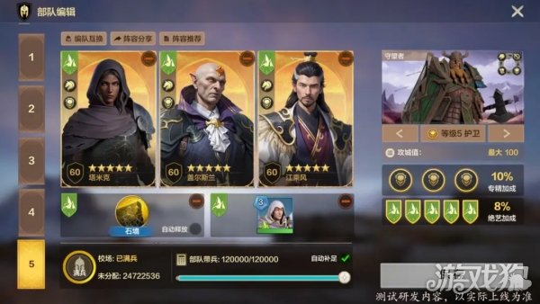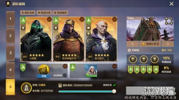 打法思路:该套阵容属于承伤能力极高的前排队伍,拥有非常强力的护盾技能,同时还具有多种削弱和增益效果,可以在团战中吸收大量伤害。盖尔斯兰的阵容适应性极强,与全部岩绝艺英雄都可以搭配,岩印记和护盾使其成为完美的岩绝艺阵容辅助英雄。总结作为千里之行第二阶段的奖励英雄,盖尔斯兰非常适合作为第二支岩卫队伍的核心英雄,可以帮助领主大人快速开荒,而且他的阵容适应性极强,前、中、后期都可以使用,培养价值极高,推荐大家优先招募培养。