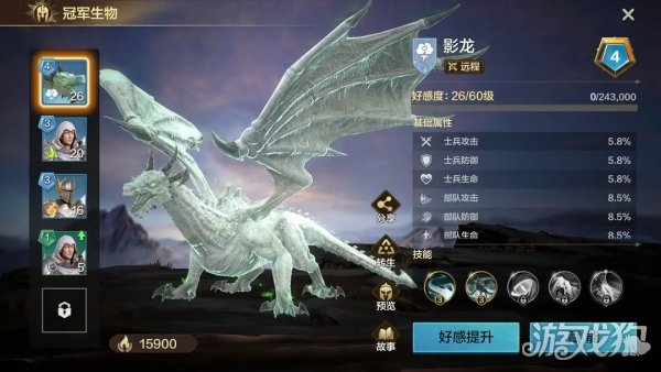 2、冠军生物主要包括好感度提升和赋能两种,前者提升士兵属性,后者提升部队属性,还会解锁新技能,特别是技能对于队伍提升非常大。
