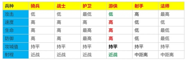 兵种属性在搭配阵容前,我们首先要了解游侠兵种的属性特点,这样才能扬长避短,针对性搭配。