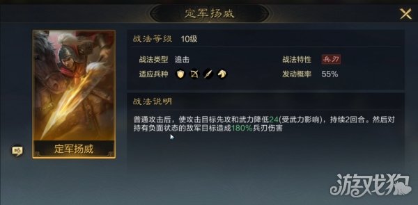 定军扬威 追击 敌军群体 50% 普通攻击后,使其先攻和武力降低24(受武力影响),持续2回合。然后对所有持有负面的敌军目标造成180%兵刃伤害。