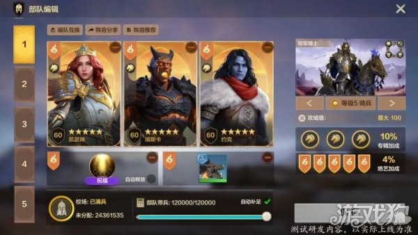 打法思路:该套阵容以连击、暴击为核心机制,普通攻击伤害为主要输出手段,配合幽影龙的属性提升效果和凯瑟琳的击溃回复兵力技能,战场生存能力和持续输出都十分强力。