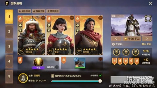打法思路:该套阵容以被动判定普攻伤害为主,并且具有兵力越高、伤害越高的特性,配合阿拉坦和幽影龙的技能属性提升效果,使队伍拥有较高的生命和免伤提升,可以克制技能伤害型阵容。