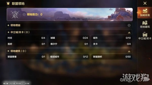 1、加成总览该页面展示了联盟当前占据的所有中立城/关卡和领地建筑,领地会为全体成员带来增益效果,并根据势力值给予每日资源奖励。