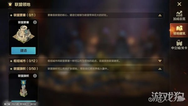 2、领地建筑联盟领地范围需要由建筑进行连通扩张,其中联盟要塞是建筑的基础,枢纽城市可以连接其他建筑,联盟旗帜可以用于拓张领地势力范围,修建建筑需要消耗联盟积分和联盟令牌。