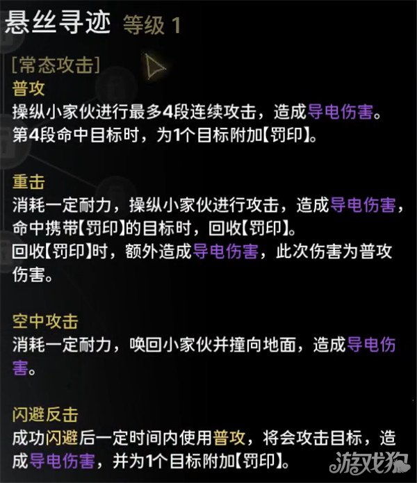 闪避反击:成功闪避后一定时间内使用普攻,将会攻击目标,造成导电伤害,并为1个目标附加(罚印]。