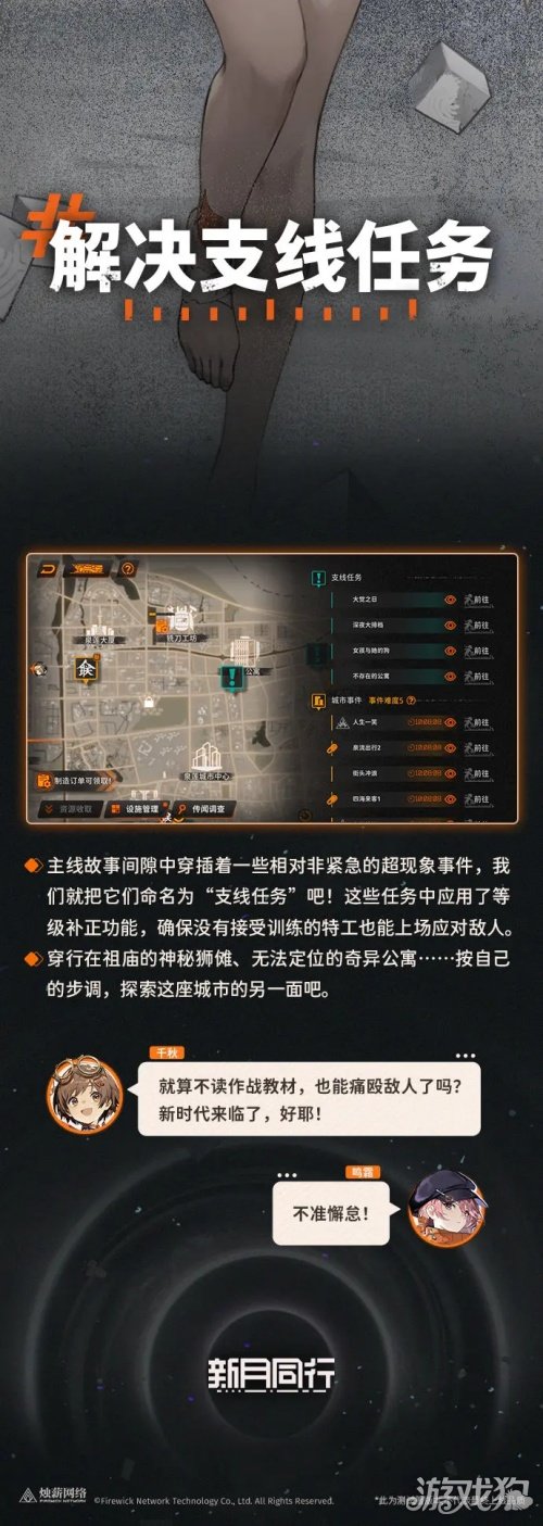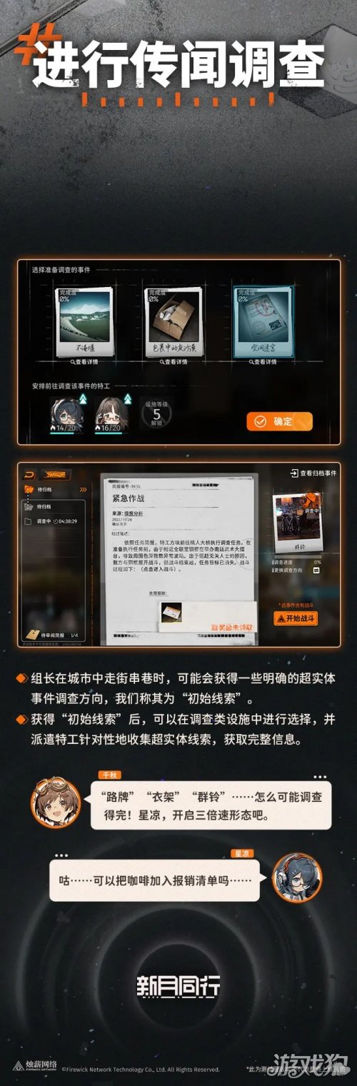 新月同行超管局特工从入门到精通小队行动手册。组长在城市中走街串巷时,可能会获得一些超实体事件线索,可在调查类设施中进行调查,并派遣特工针对性地收集超实体线索,获取完整信息。路牌、衣架、群铃……怎么可能调查得完,星凉,开启三倍速形态吧。