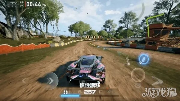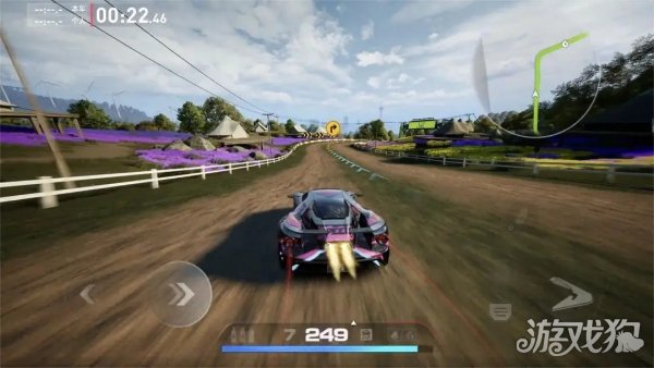 回到赛道本身,赛道起点附近是车手们比较熟悉的花田景观,随后经过两个直角弯,便会进入泥地赛道。泥地在这条赛道中占有一半左右的比例,在外观改装中将悬挂高度抬高一些或许会获得些许优势哦(实际上并没有)。