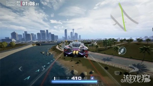 在此之后,车手们会驶过一条大直道,直道左侧有一条河道,奔涌的水流和车手一起冲向各自的终点而去。转过最后一个弯角,便来到的跨越河流的下山大飞跃!伴随着加速带与氮气加速带来的强劲动力,车手们将会以超过400公里每小时的速度飞向河流对面的道路。人们常说,在空中可以看见更多平常观察不到的美景。此时,远处热湾市中心的高楼大厦就像积木一样尽收眼底,谁看了不迷糊!
