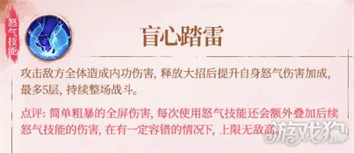 攻击敌方全体造成内功伤害,释放大招后提升自身怒气伤害加成,最多5层,持续整场战斗。