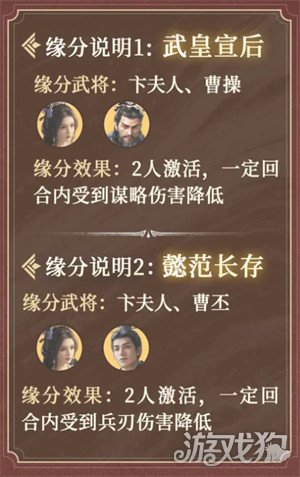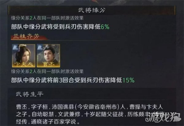 她跟两个武将是有缘分效果的,其一是曹操,2人激活后,受到的谋略伤害会少不少;第二个缘分就是和曹丕,将状态触发,可降低两个人受到的兵刃伤害。