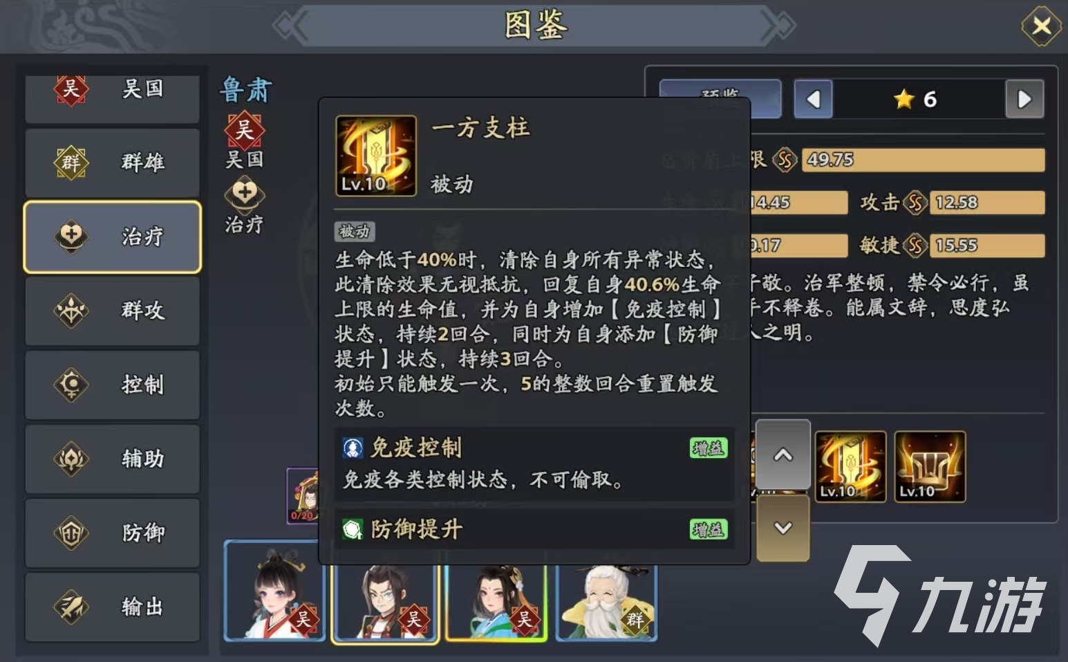 鲁肃的第1个被动提高自身抗性,在回合结束时有几率清除自身的异常状态,另外可以提升另一个被动的效果。另一个被动是一方支柱,在鲁肃生命值低于40%的时候,会自动将身上所有的异常状态清除,此清除效果无视抵抗还能额外恢复自身40.6%生命值上限的血量,同时增加免疫控制状态,持续两回合,还能额外添加防御提升状态,持续三回合。
