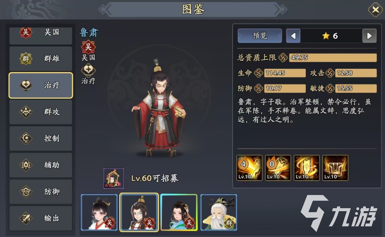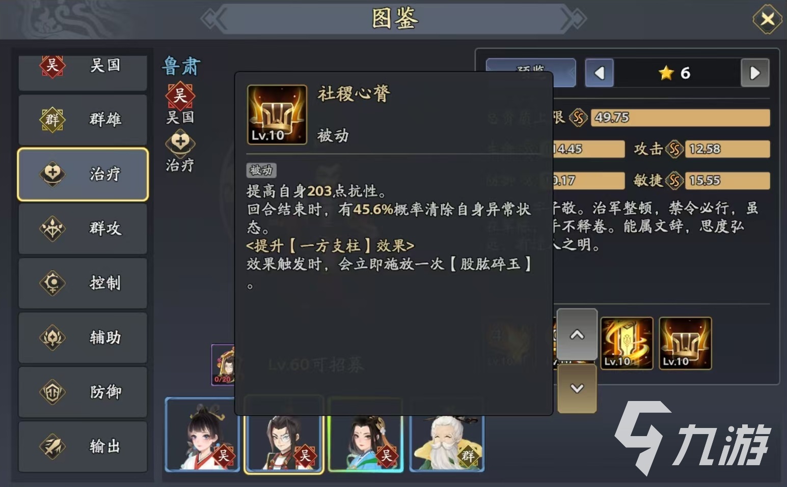 这个被动的触发也很有特点,初始只能触发一次,后续凡是5的整数回合都会重置触发次数,所以即使战斗的回合数比较长,鲁肃的被动依然有发挥的空间。主动技能效果是伤害敌方前排目标,按照敌方的生命上限来附加伤害,同时恢复少量生命值,还有几率对目标造成流血状态,使对方降低攻击力,降低受到治疗的效果,还能额外掉血。必杀技是对己方全体目标释放,恢复生命值并添加防御提升状态,持续三回合。如果当前目标处于异常状态,受到的治疗量提升,且能够将异常状态驱散。