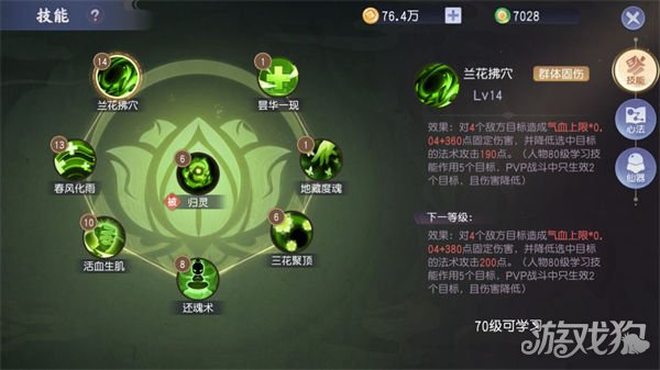注意蓬莱岛职业的血量一定要堆起来,因为技能也是要看血量的多少来定伤害或者能恢复多少。这个技能是群伤攻击类型的技能,虽然打的伤害是不高,但是好在可以降低敌方选中目标的法术伤害(注意是选中目标,也就是手动技能选中的一个目标),这个技能挂图的时候可以用用,困难副本或者任务不要去点它。