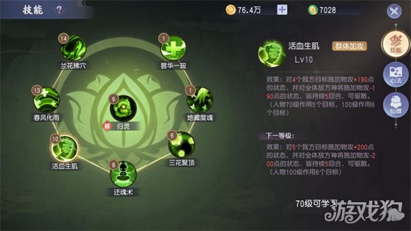 强力的群体恢复血量的技能,唯一要注意的一点是加血技能是可以暴击的。同理神将的加血技能也受法术暴击的影响。这里多说一句,既然选择了蓬莱岛这个职业,那么上阵的神将就可以少上个治疗的神将了,毕竟阵容算上人物的职业一共就六个,要是上个双治疗神将,那这个阵容大概率输出是不够的,遇到有打蓝的职业时很快就会败下阵来。