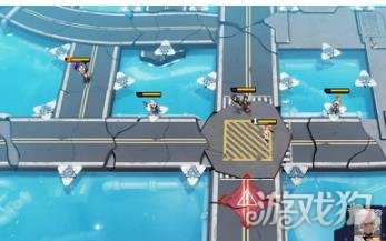 5、接着第四波,等boss走到消防栓旁边的时候,把粉毛放到上面,吸引等下要来的两个藏眼的激光攻击,把两个激光都骗出来之后,把粉毛放回到艾雯下面,接着进行如图的站位,等清杂结束,把粉毛放到boss挨着,然后解决boss。