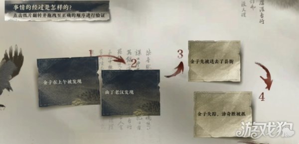 3、打听完消息,会进行一次推理,正确的推理顺序是:【金子在上午被发现】→【由丁老汉发现】→【金子先被送去了县衙】→【金子失踪,涂奇胜被抓】