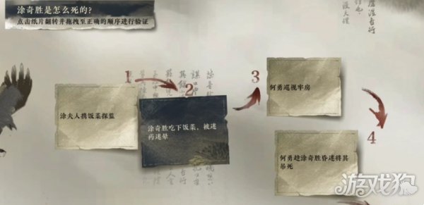 5、涂奇胜死亡推理顺序:【涂夫人携饭菜来探监】→【涂奇胜吃下饭菜,被迷药迷晕】→【何勇巡视牢房】→【何勇趁涂奇胜昏迷,将其吊死】。